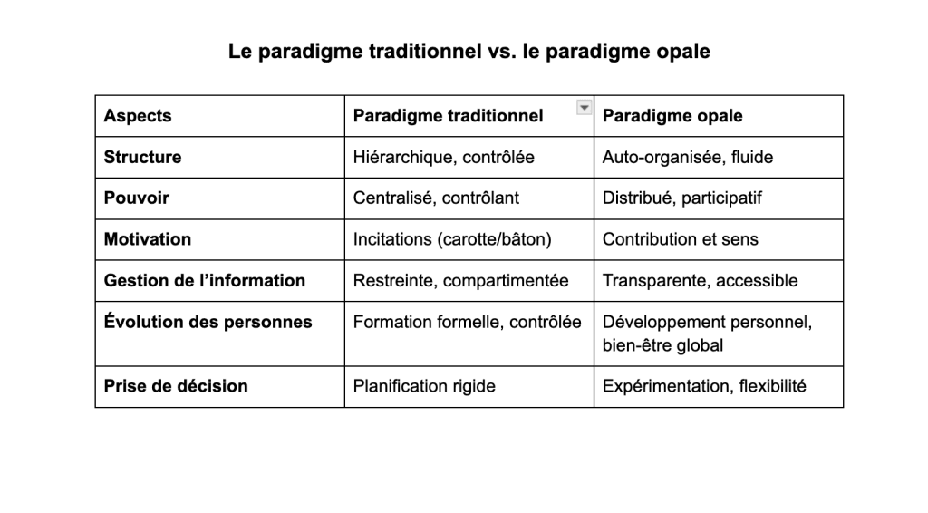 Le monde du travail évolue, et avec lui, la manière dont nous concevons l’organisation. En observant les entreprises traditionnelles, nous retrouvons des structures hiérarchiques et des pratiques de gestion qui se sont développées au fil des décennies. Cependant, de nouvelles organisations émergent, guidées par un paradigme radicalement différent : le paradigme Opale. Ce changement représente une réinvention des pratiques organisationnelles, adaptée aux besoins modernes d’autonomie, de sens, et de bien-être. Mais qu’est-ce qu’un changement de paradigme ? Et que signifie adopter un paradigme Opale ?